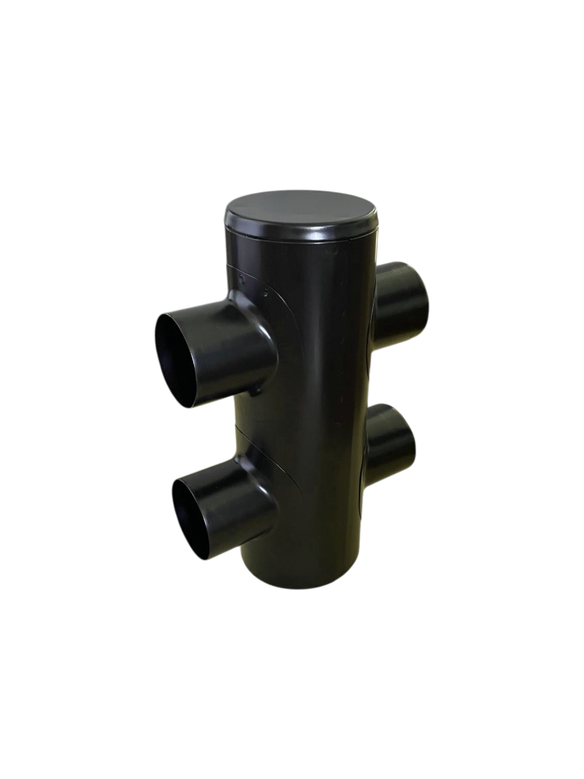 Modular galvanized steel distribution plenum with one inlet and multiple outlets.