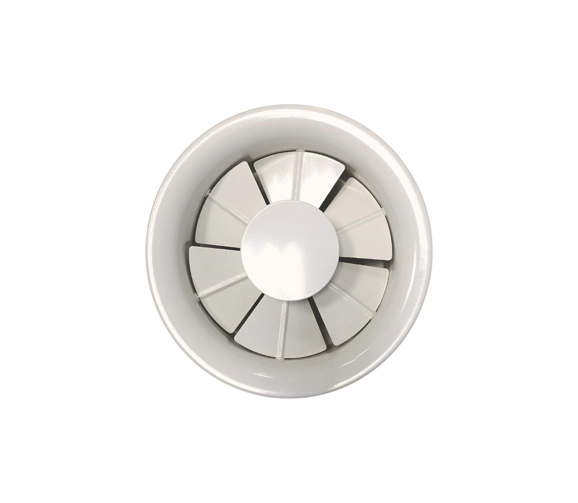 Diffusori circolari a geometria variabile, con lancio elicoidale, per grandi altezze di installazione. Lancio regolabile.