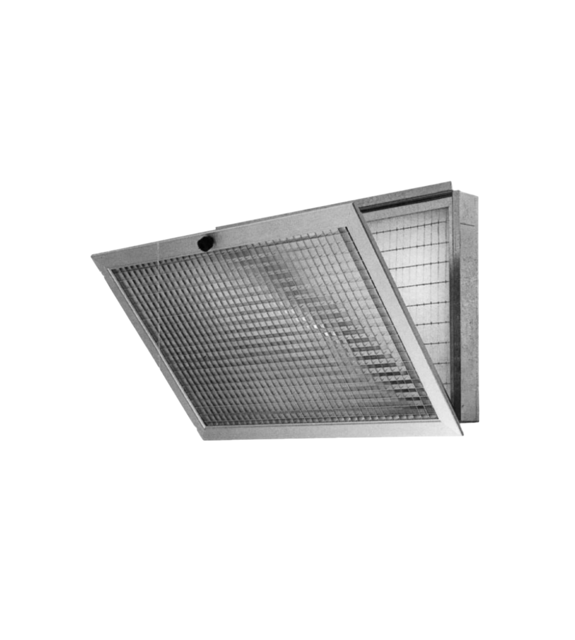 Griglie di ripresa portafiltro a maglia quadra con controtelaio incernierato apribile per l’alloggiamento e la sostituzione del filtro.